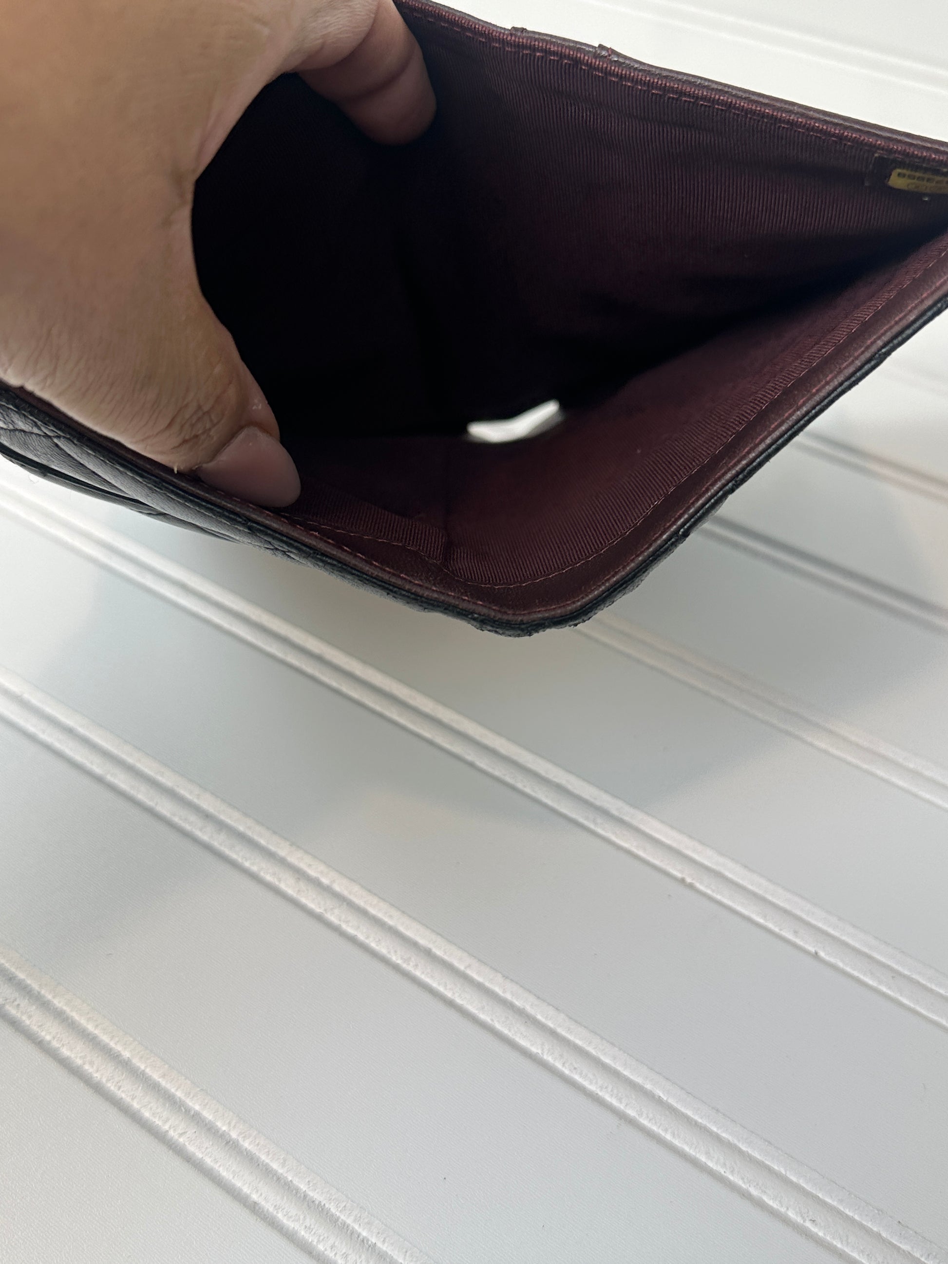This pre-owned CHANEL Lambskin Matelasse Long Black Wallet exudes refined sophistication with its supple lambskin leather and iconic quilted pattern. Accented by elegant silver metallic details, it features a striking burgundy interior that adds a subtle pop of color. Designed to offer organized storage while showcasing timeless luxury, this wallet is the perfect blend of style and function.