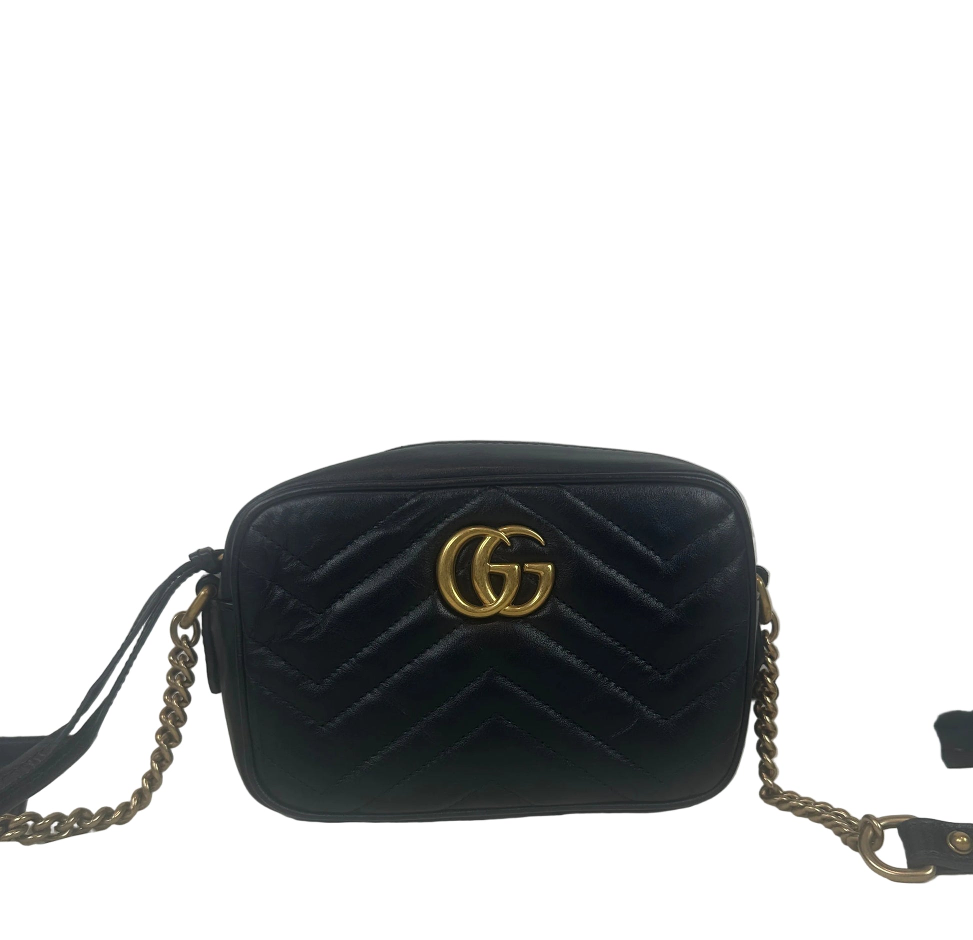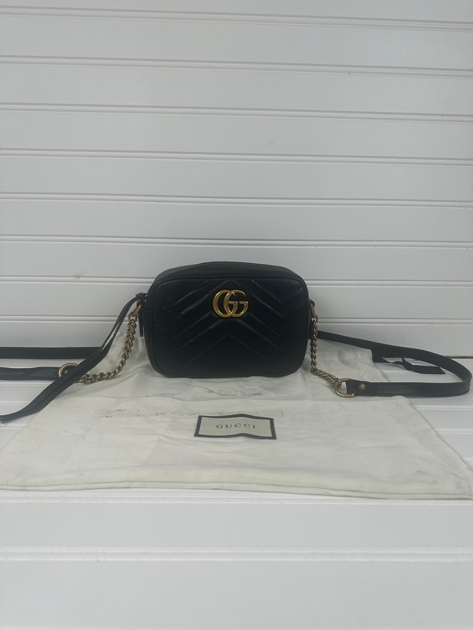 Elevate your accessory game with this iconic pre-owned GUCCI GG Marmont camera bag in luxurious black leather. Featuring the signature matelassé chevron quilting and distinctive GG hardware in gleaming gold tone, this versatile shoulder bag delivers timeless elegance with modern functionality. The compact camera silhouette makes it perfect for everyday wear or special occasions, while the included dust bag ensures your investment stays protected. Own a piece of luxury heritage at a fraction of the original price.