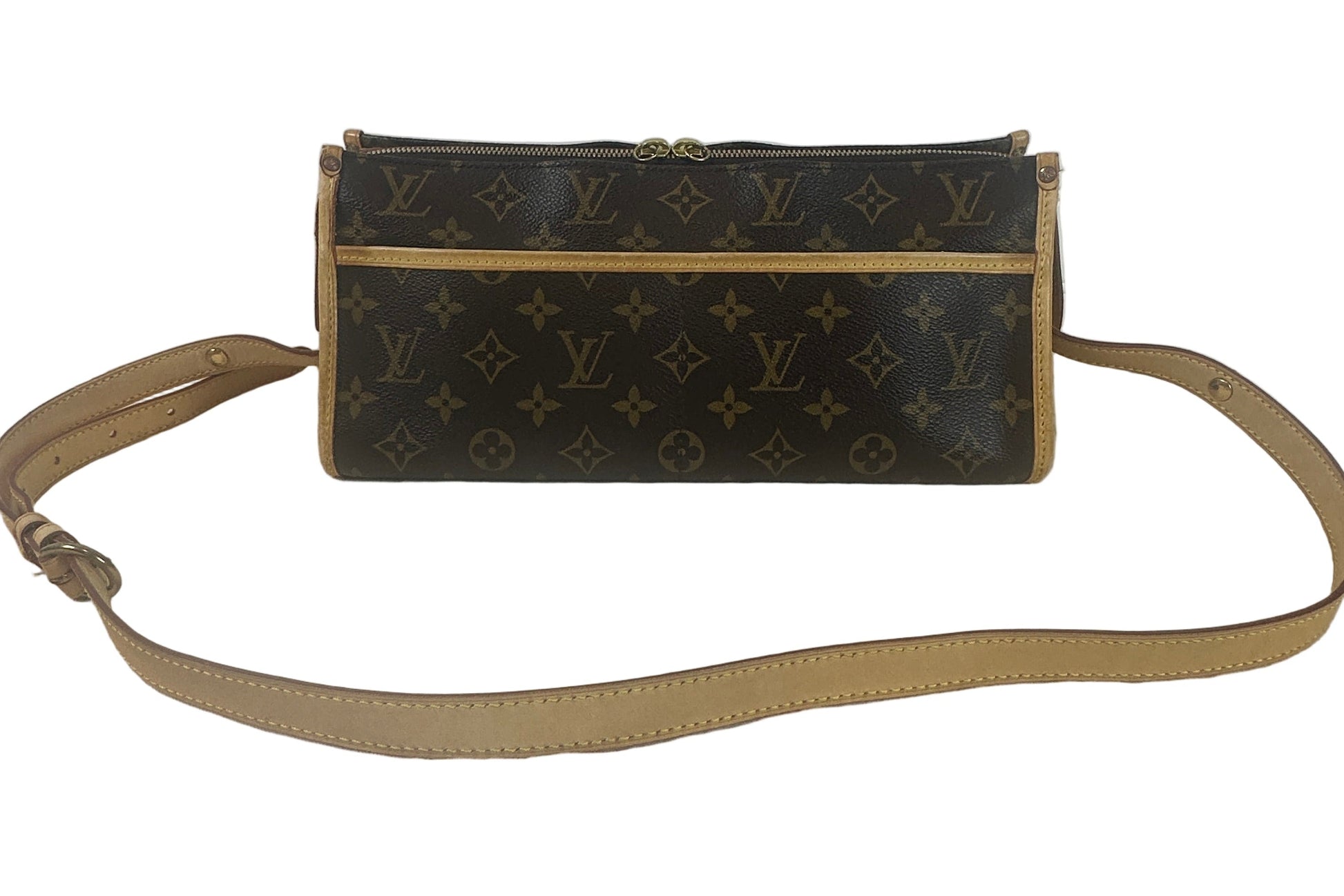 The pre-owned Louis Vuitton Popincourt features the iconic Monogram canvas, complete with a convenient strap and protective dust bag, combining classic elegance with practical design.