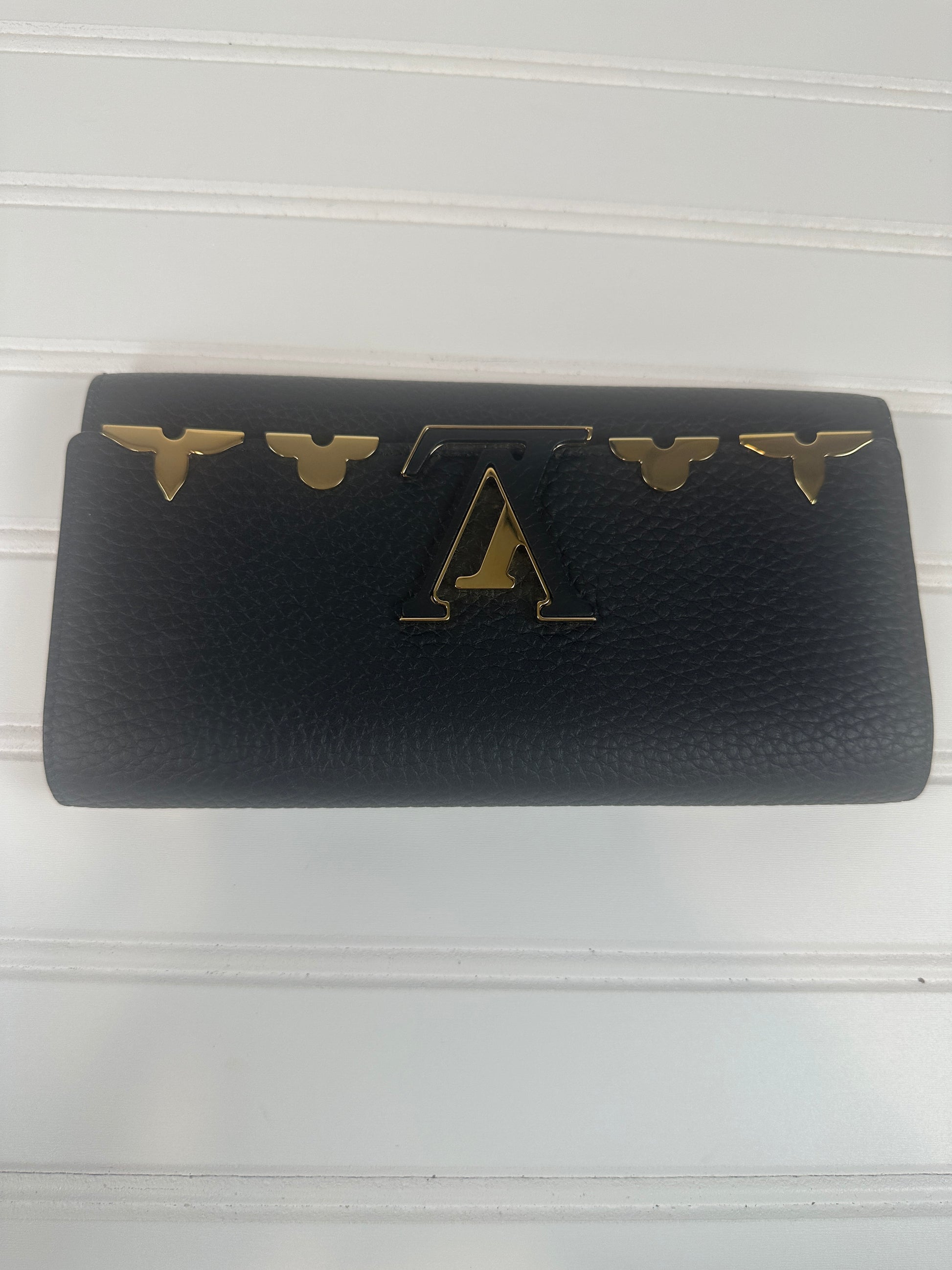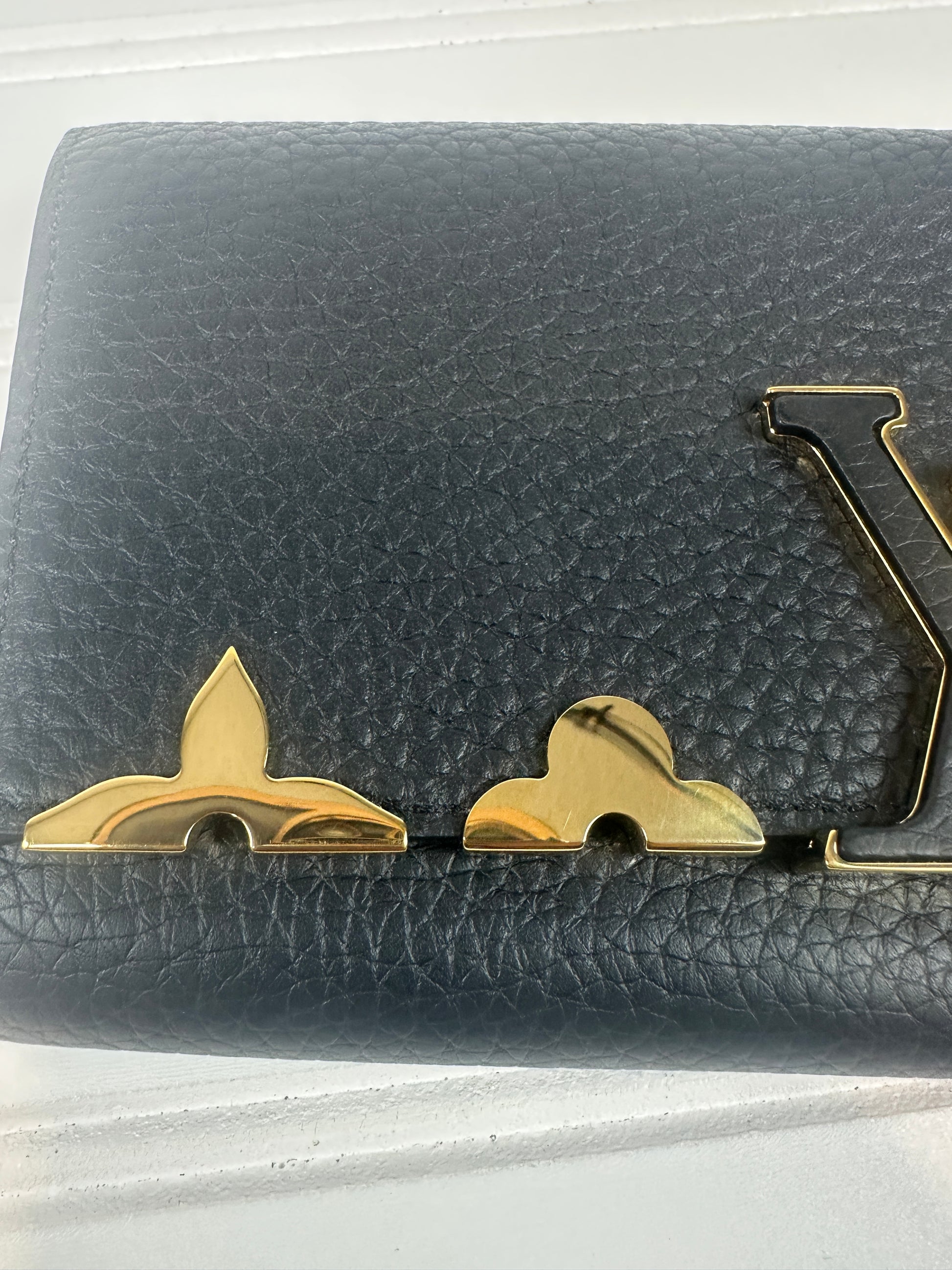 Elevate your everyday carry with this authentic pre-owned Louis Vuitton Capucines Compact Wallet in sophisticated black. Crafted with the house's signature craftsmanship, this luxurious piece combines timeless elegance with practical functionality, featuring multiple card slots and a coin compartment. The iconic design makes a refined statement while maintaining the durability Louis Vuitton is renowned for. Complete with original box and dust bag, this is an exceptional opportunity to own a coveted luxury accessory at a more accessible price point. Perfect for the discerning collector or anyone seeking investment-worthy style.